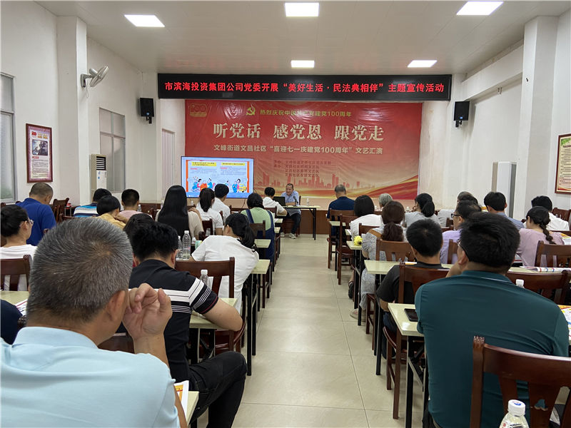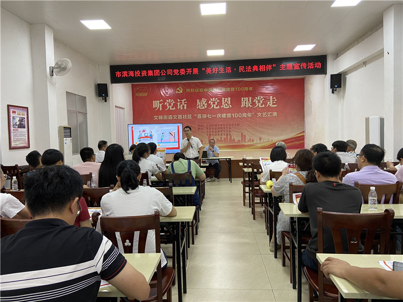 2021年6月28日,集團公司黨委組織黨員干部到文昌社區(qū)開展“美好生活·民法典相伴”主題宣傳活動。并在文昌社區(qū)新時代文明實踐大課堂舉辦了一場《中華人民共和國民法典》宣傳宣講。