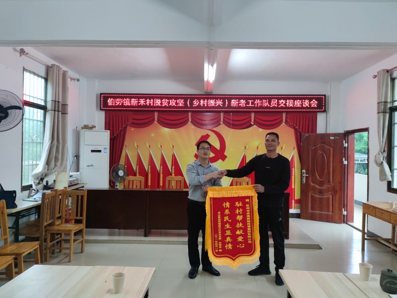 二、2021年4月26日,集團(tuán)公司與市檔案館、市林科所、伯勞鎮(zhèn)黨委主要領(lǐng)導(dǎo)和新派駐工作隊員一同抵達(dá)靈山縣伯勞鎮(zhèn)新禾村,召開了伯勞鎮(zhèn)新禾村脫貧攻堅(鄉(xiāng)村振興)新老工作隊員交接座談會。座談會上,參會領(lǐng)導(dǎo)與新老工作隊員敞開心扉暢談,全面了解工作隊員近期工作情況、思想動態(tài)、遇到的困難等。參會領(lǐng)導(dǎo)對老一屆工作隊員在脫貧攻堅期間所取得的成績給予高度評價和認(rèn)可,并對新一屆工作隊員提出具體要求和希望。要求老隊員站好最后一班崗,做好傳幫帶工作,新隊員要不畏艱苦,團(tuán)結(jié)村“兩委”,在鄉(xiāng)村振興工作中奮勇爭先。座談會結(jié)束后,舉行了贈送錦旗儀式。