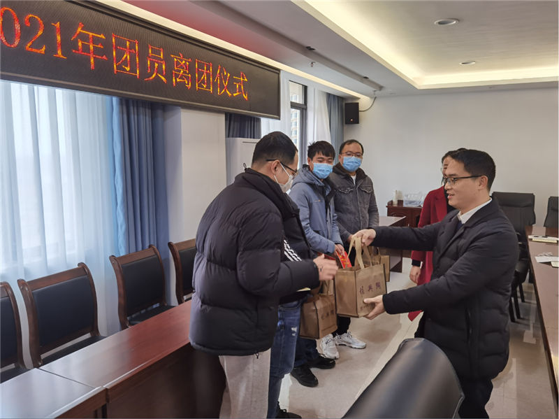 (圖為團委書記黃耀世傳達學習十九屆六中全會精神) 離團團員逐個發(fā)表了離團感言,回憶了與共青團共同成長的心路歷程,通過自己在思想和工作中的進步及收獲,勉勵團員青年們不忘初心、奮勇前進,并紛紛表示將一如既往的努力工作,勇挑重擔,積極向黨組織靠攏,在集團轉(zhuǎn)型升級中揮灑青春,不懈奮斗。耀世書記帶領滿齡團員們重溫了入團誓詞,為他們摘下團徽,贈送了《中國共產(chǎn)黨章程》,儀式在一起奏唱國歌中拉下帷幕。 (圖為團委書記黃耀世帶領離團團員重溫入團誓詞) 集團公司黨委卜玉聲副書記為離團青年贈送離團紀念品,充分肯定了集團公司團委所取得的成績,肯定了青年團員對集團公司發(fā)展、黨委工作開展的支持和努力,并對團員青年們提出三點希望。一是政治上要持續(xù)進步。共青團作為黨的助手和后備軍,廣大團員青年要追求共產(chǎn)主義信仰,積極向黨組織靠攏;二是業(yè)務上要持續(xù)提升。廣大青年要立足本職崗位,堅持不懈鉆研業(yè)務,勤奮工作,積極作為;三是素質(zhì)上要持續(xù)提高。廣大青年要不斷提高個人品格和綜合素養(yǎng),拓展人生的寬度和厚度,多學習多讀書,加強黨史學習教育,樹立正確的價值取向,多為集團公司轉(zhuǎn)型發(fā)展出謀劃策。 (圖為集團公司黨委副書記卜玉聲為離團團員發(fā)放紀念品并作重要講話)