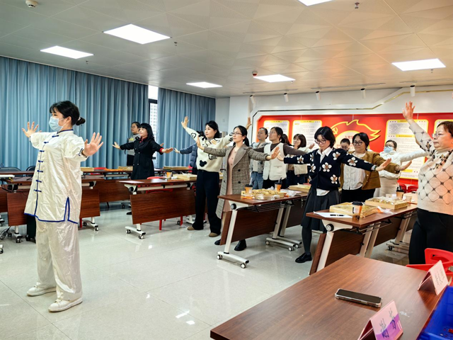 授課過程中,講師還為女職工設(shè)置了中醫(yī)文化體驗(yàn)環(huán)節(jié)。專業(yè)的中醫(yī)養(yǎng)生教練身著傳統(tǒng)服飾,身姿矯健地站在前方,為女職工們示范八段錦的標(biāo)準(zhǔn)動(dòng)作。“雙手托天理三焦,左右開弓似射雕……” 教練一邊口中念念有詞,一邊緩緩展示著一招一式,動(dòng)作行云流水、剛?cè)嵯酀?jì)。練習(xí)過程中,女職工們屏氣斂息,專注于每一個(gè)動(dòng)作的細(xì)節(jié),感受著身體的拉伸與舒展,仿佛在一招一式間與古老的中醫(yī)養(yǎng)生智慧對(duì)話。八段錦不僅讓女職工們體驗(yàn)到傳統(tǒng)健身方式的魅力,更在動(dòng)靜結(jié)合中舒緩了身心壓力,調(diào)節(jié)了氣息。許多女職工表示,練習(xí)完八段錦后,身體微微發(fā)熱,整個(gè)人都神清氣爽,仿佛充滿了能量。