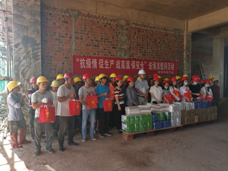 7月13日,欽州市總工會(huì)調(diào)研員黃春雯等一行到我集團(tuán)公司負(fù)責(zé)建設(shè)的欽州是茅尾海監(jiān)控監(jiān)測(cè)管理基地項(xiàng)目現(xiàn)場(chǎng),開展“抗疫情 促生產(chǎn) 戰(zhàn)高溫”送清涼慰問(wèn)活動(dòng)。在炎炎夏日,為現(xiàn)場(chǎng)辛勤勞作的農(nóng)民工獻(xiàn)上一份清涼。致謝每一位在一線工作的人員,感謝他們?yōu)槲覀兂鞘邪l(fā)展貢獻(xiàn)一份力量。