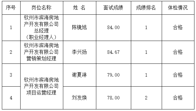 根據(jù)集團公司2024年8月13日發(fā)布的《欽州市濱海新城投資集團有限公司招聘公告》,經(jīng)報名、資格審查、面試、考察、體檢等程序,經(jīng)集團公司黨委研究決定,現(xiàn)對欽州市濱海房地產(chǎn)開發(fā)有限公司總經(jīng)理(職業(yè)經(jīng)理人)、營銷策劃經(jīng)理及項目運營經(jīng)理3個崗位擬聘用人選予以公示。