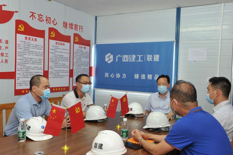 莫錦榮(中)在項(xiàng)目部黨員活動(dòng)室開(kāi)展座談