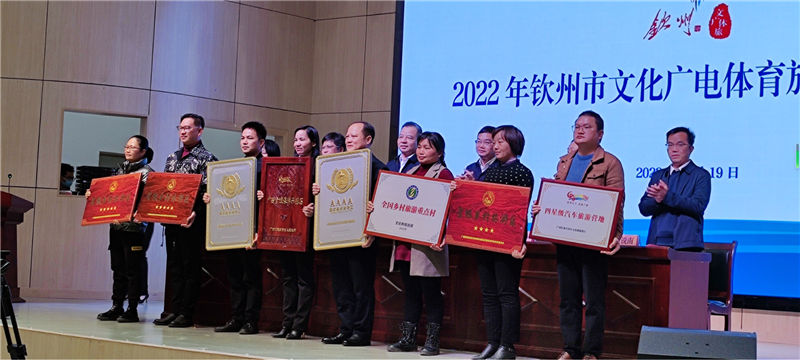 (集團公司副總經理楊新棟在會上作交流發(fā)言) 集團公司副總經理楊新棟出席會議,并在會上以《踐行新發(fā)展理念,推動文化旅游發(fā)展》為主題作交流發(fā)言。近年來,集團公司深入貫徹落實自治區(qū)和市委、市人民政府關于促進文化建設和旅游發(fā)展的重大決策部署,建設文化旅游強市,積極踐行文化旅游發(fā)展新理念,以繡花功夫改造歷史文化街區(qū),以強化服務提升八寨溝旅游景區(qū)品質,積極培育文化旅游市場,發(fā)展文化旅游產業(yè)。下一步,集團公司將深入貫徹市委、市人民政府實施“建大港、壯產業(yè)、造濱城、美鄉(xiāng)村”四輪驅動戰(zhàn)略,謀劃沙井島、辣椒槌濱??叼B(yǎng)旅游度假項目,繼續(xù)完善提升歷史文化街區(qū)、八寨溝旅游景區(qū)設施,加大宣傳力度,開發(fā)優(yōu)質旅游產品,推動文化和旅游工作開創(chuàng)新局面,為我市爭創(chuàng)國家歷史文化名城、廣西旅游休閑城市增添一份力量。 集團公司副總經理楊新棟(前排右四)領取欽州老街景區(qū)評定為國家AAAA級旅游景區(qū)證書