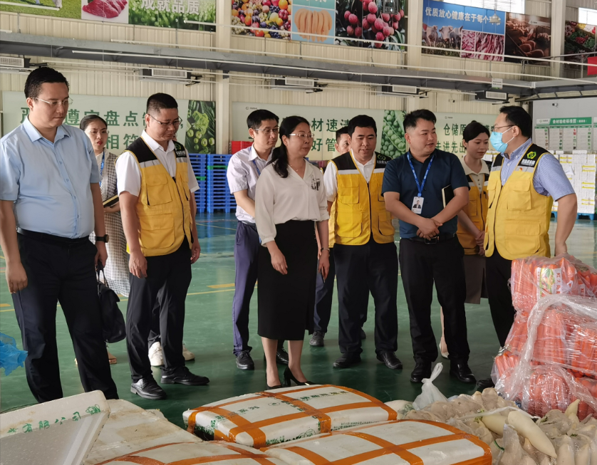調研組成員一行先后前往濱海供應鏈公司公共配送中心開展實地考察調研,期間,吳廣明向調研組詳細介紹了公司業(yè)務開展的基本情況以及公共配送中心在食材集采、收發(fā)、檢測、溯源、倉儲物流的全過程。
