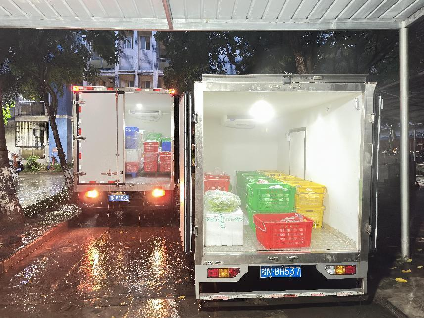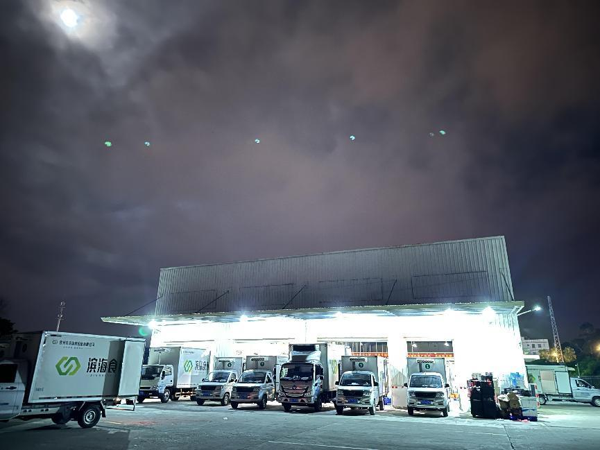 圖為凌晨兩點(diǎn),濱海食材公共配送中心的倉庫燈火通明,冷鏈車整裝待發(fā)