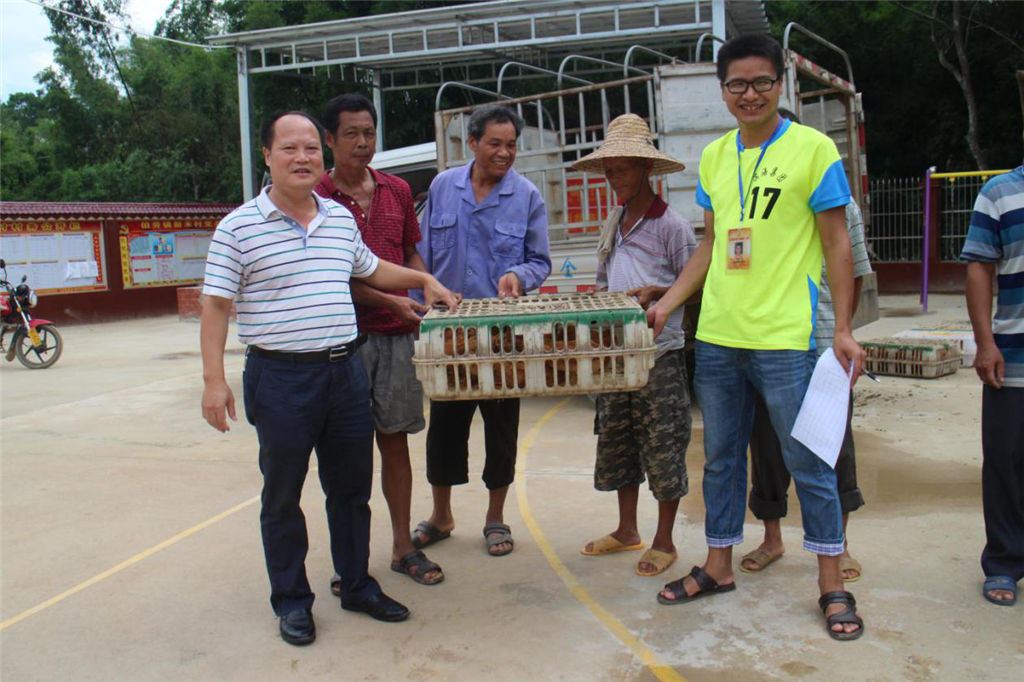 (圖為集團公司副總經(jīng)理楊新棟為貧困戶發(fā)放雞苗)
