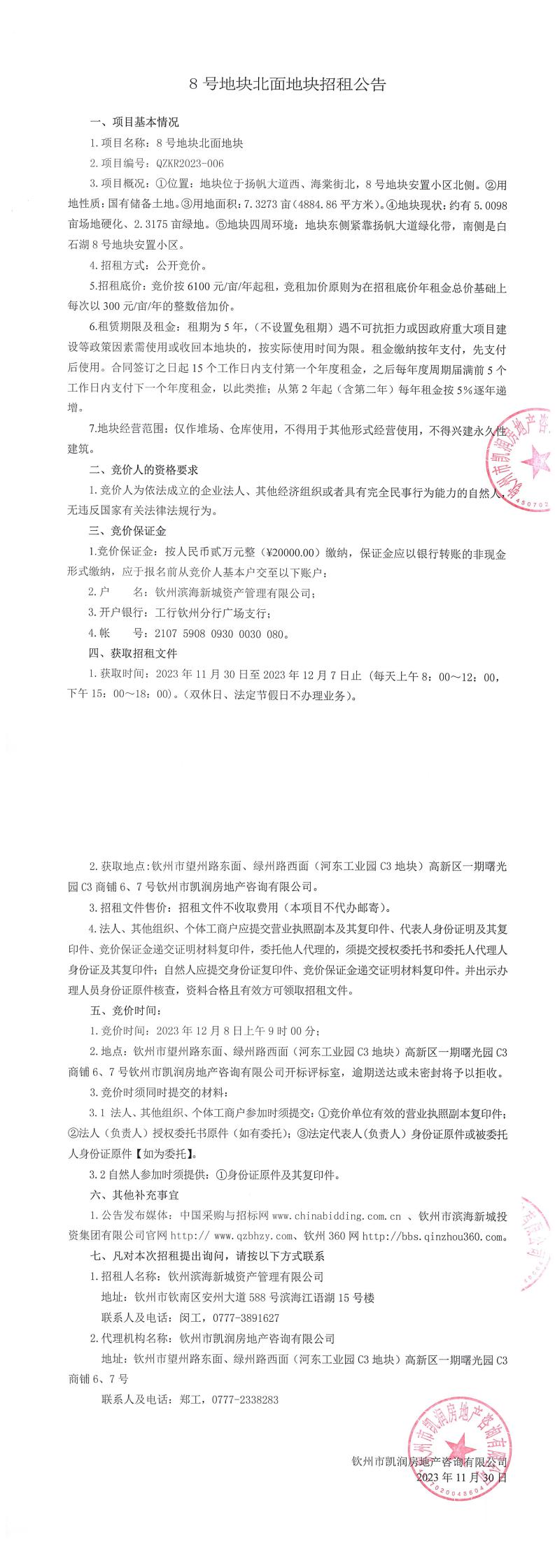 8號(hào)地塊北面地塊(QZKR2023-006)成交結(jié)果公告
