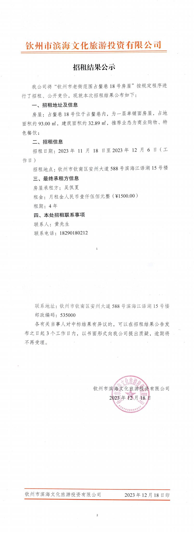 欽州市老街范圍占鰲巷67、71號(hào)兩處房屋公開招租結(jié)果公示