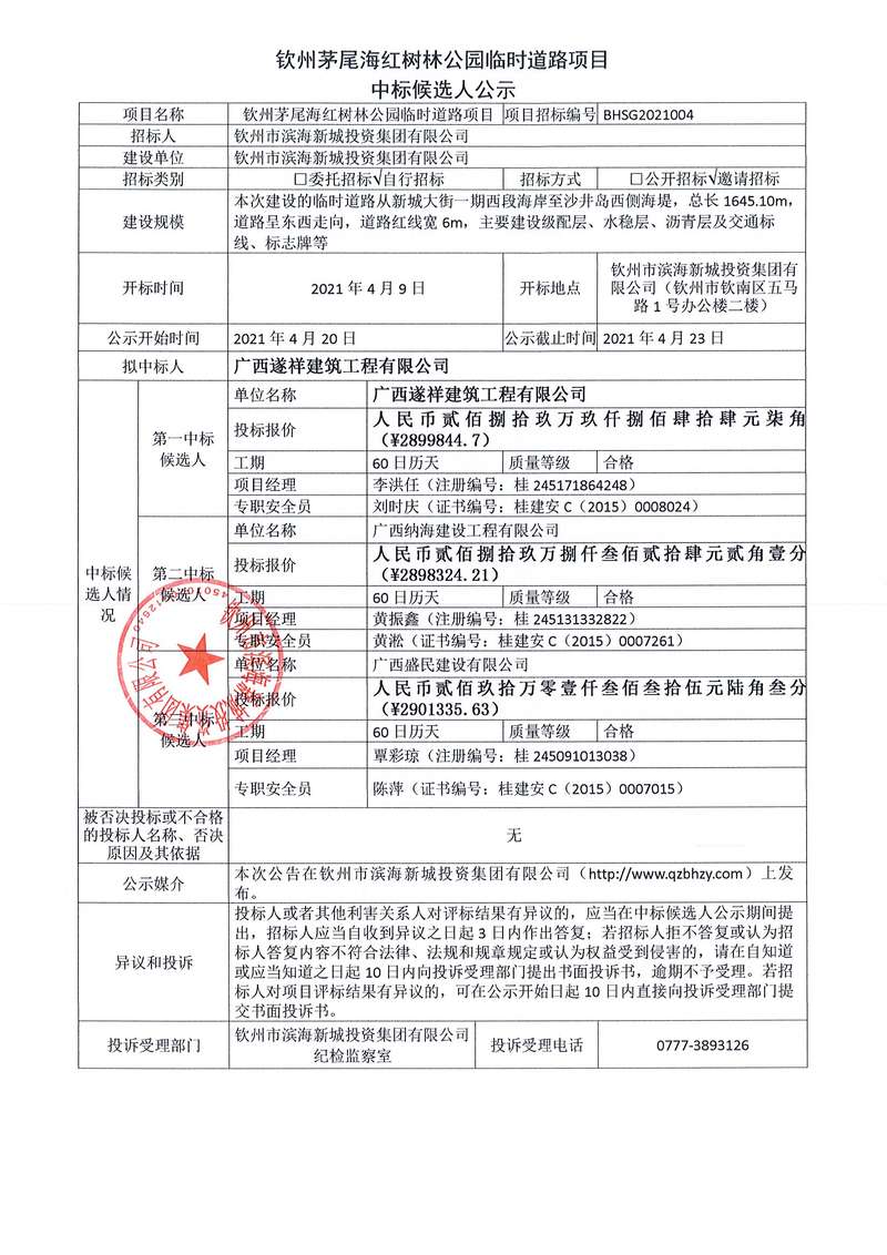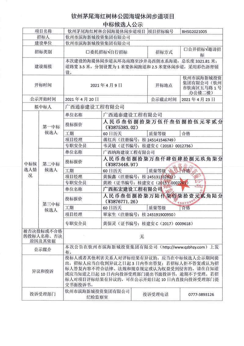 欽州茅尾海紅樹林公園臨時(shí)道路項(xiàng)目候選人公示