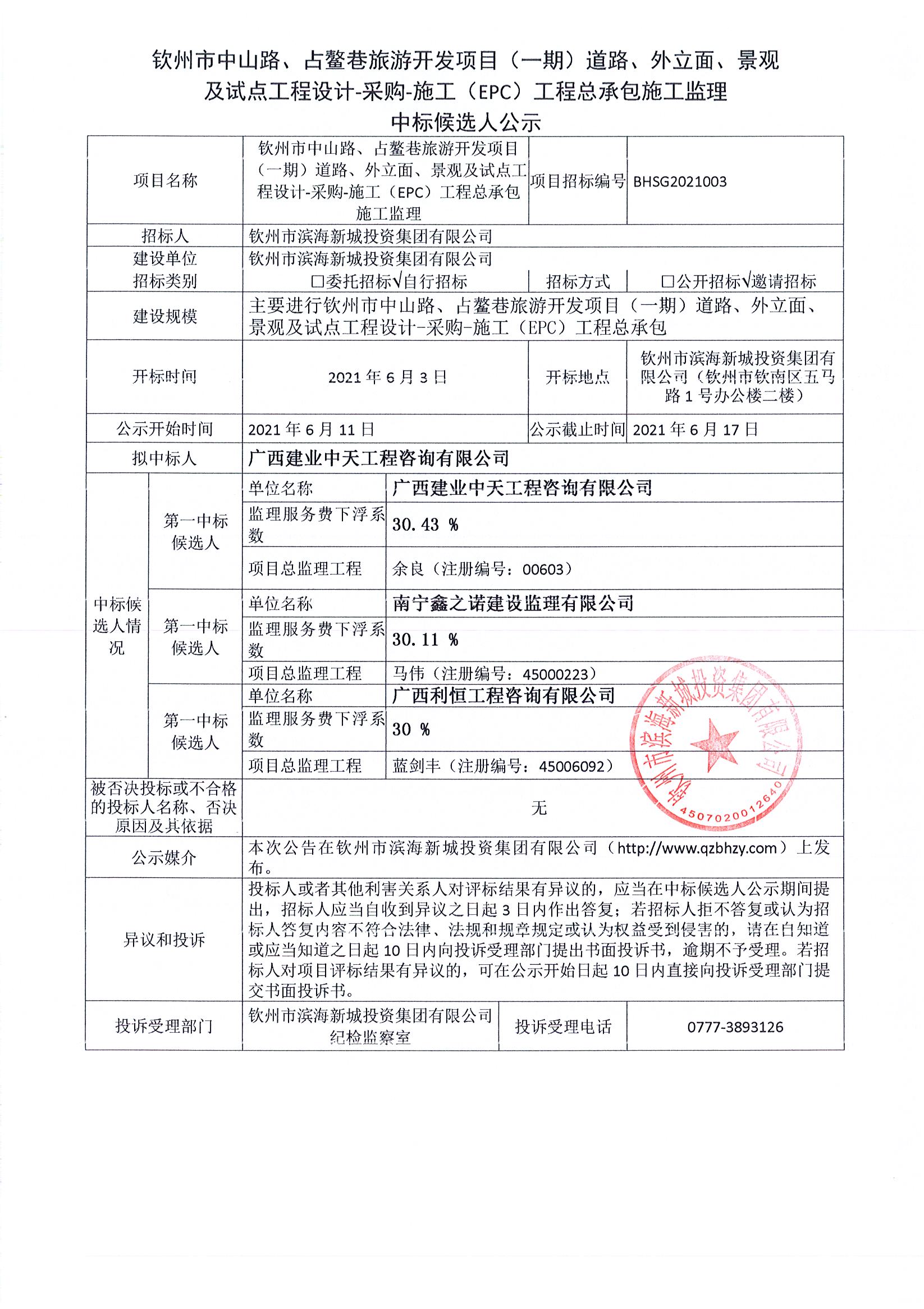 欽州市中山路、占鰲巷旅游開發(fā)項(xiàng)目(一期)道路、外立面、景觀及試點(diǎn)工程設(shè)計(jì)-采購-施工總承包監(jiān)理中標(biāo)公示
