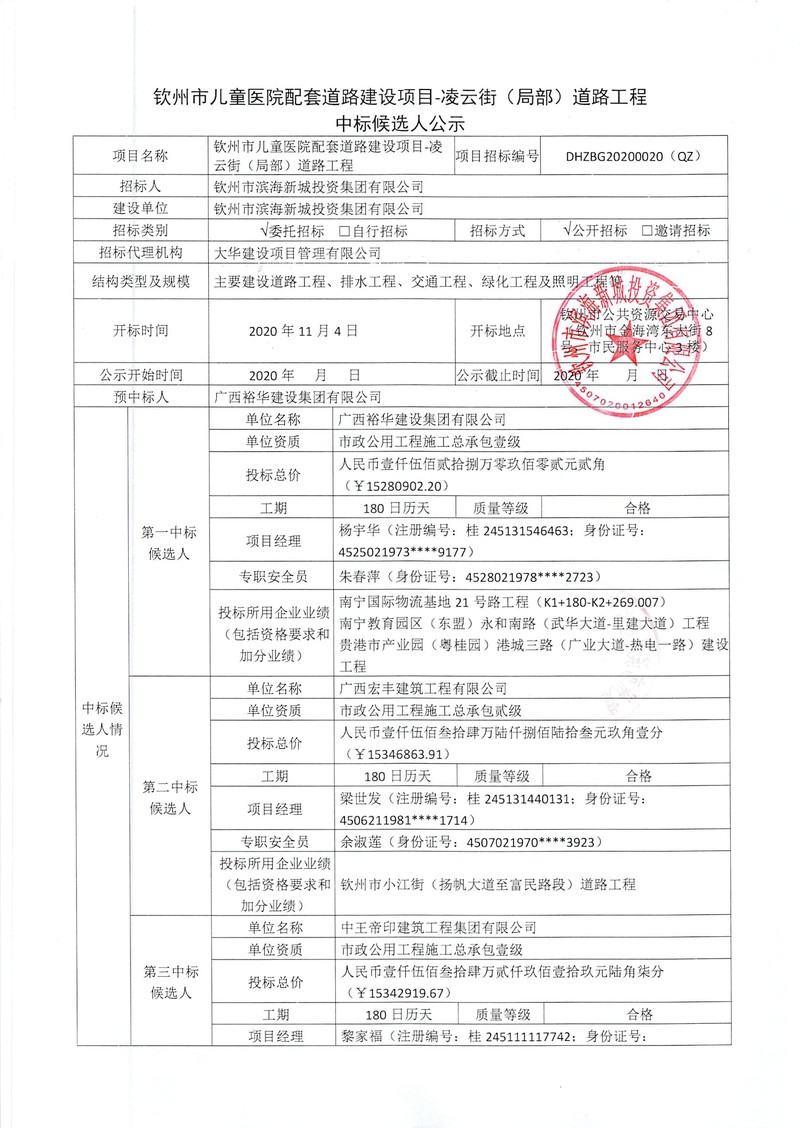 欽州市兒童醫(yī)院配套道路建設(shè)項目—凌云街(局部)道路工程中標候選人公示