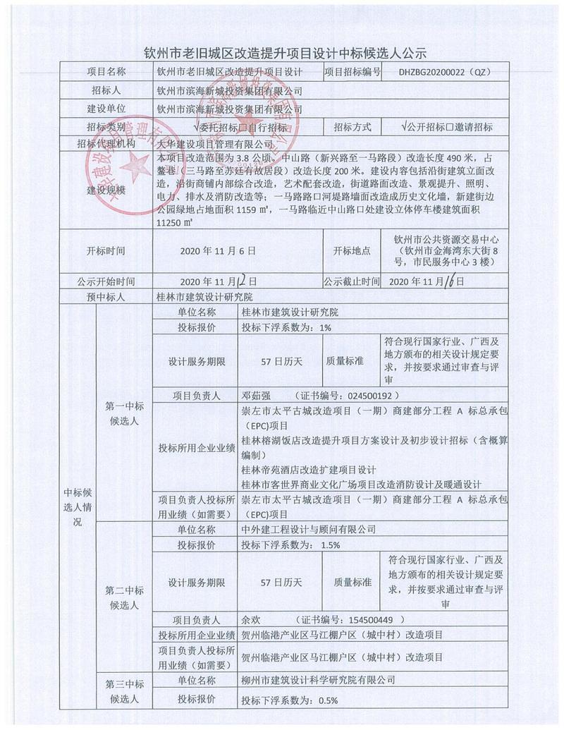 欽州市老舊城區(qū)改造提升項目設(shè)計中標候選人公示