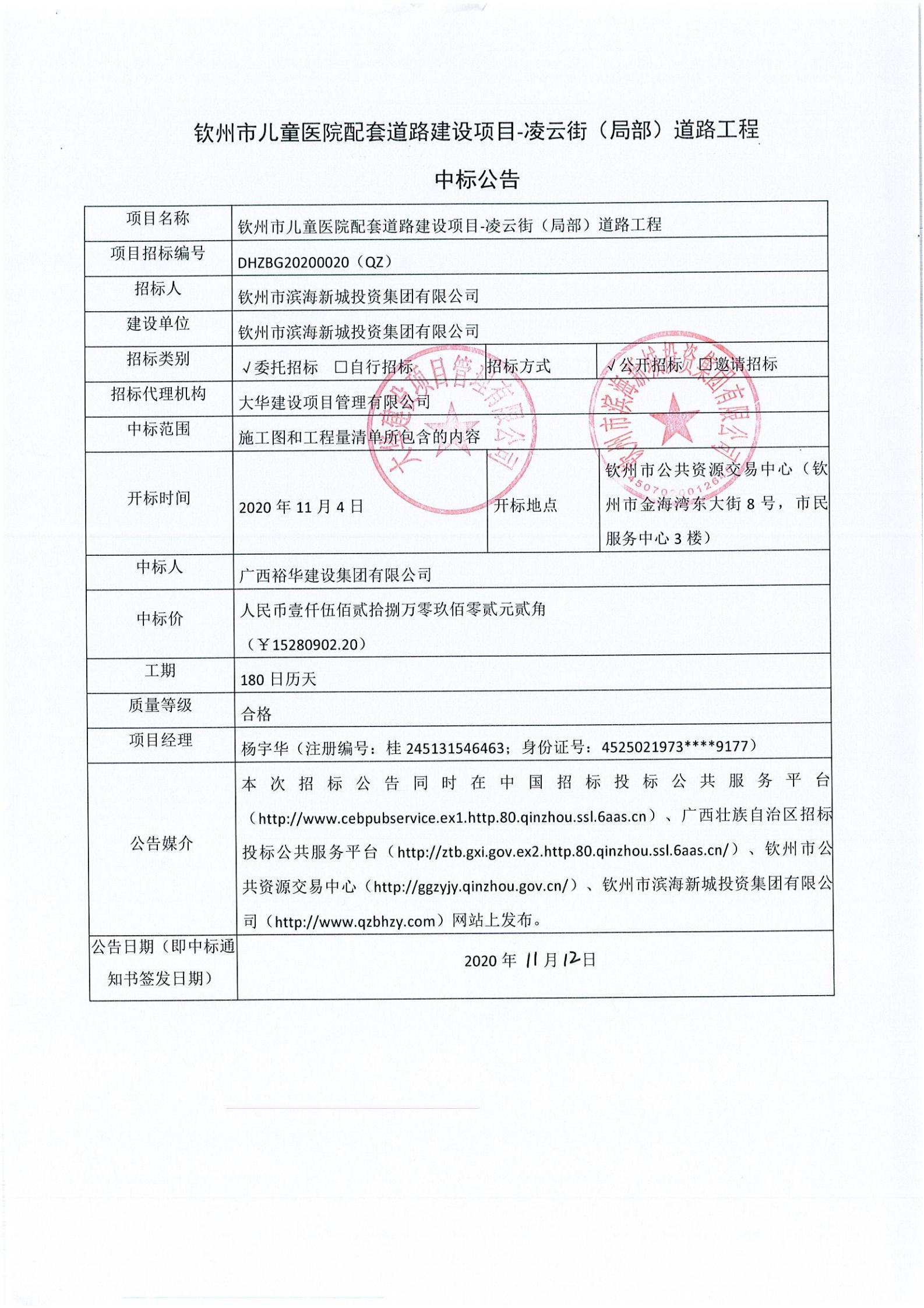 欽州市兒童醫(yī)院配套道路建設(shè)項目-凌云街(局部)道路工程中標公告