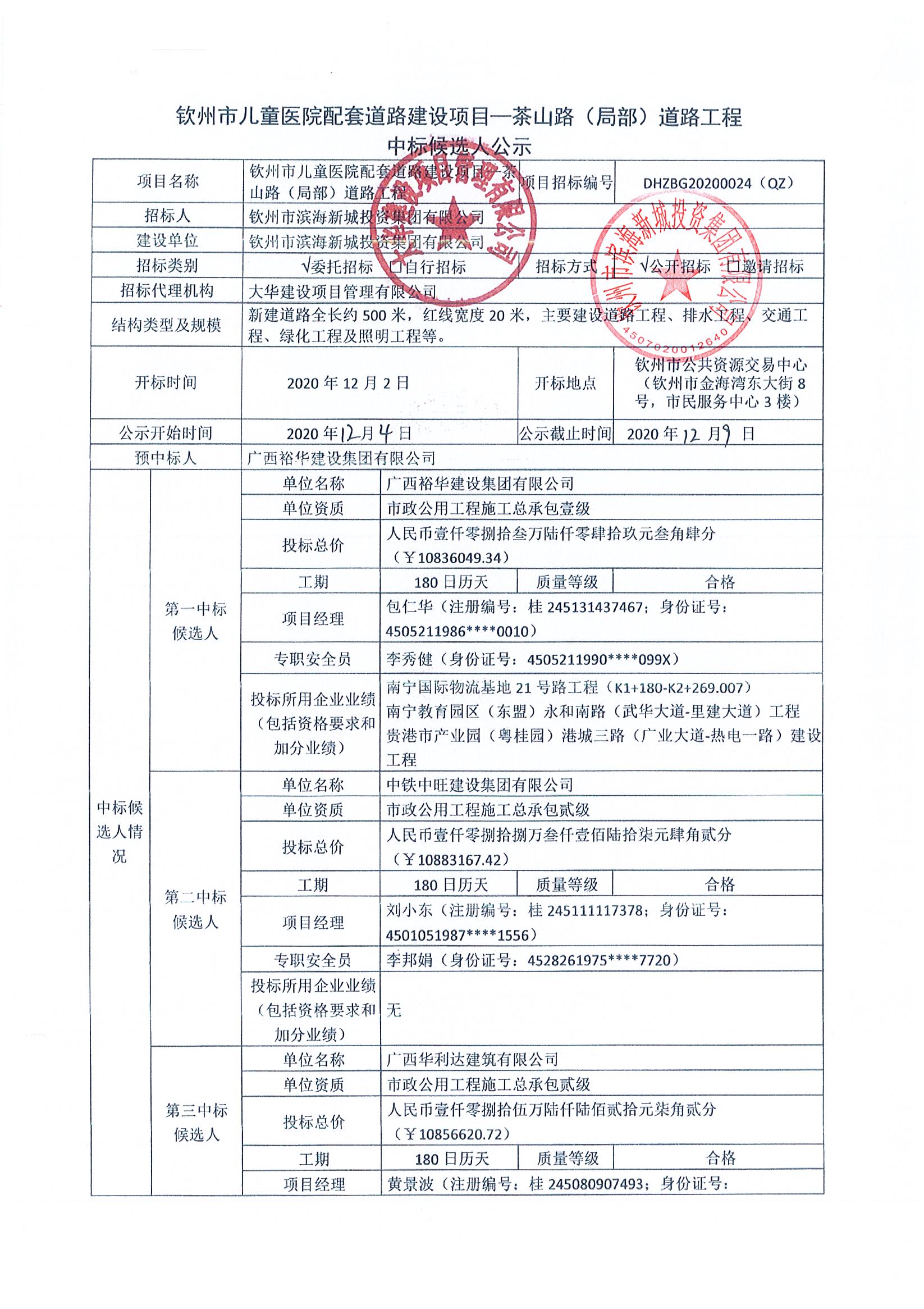 欽州市兒童醫(yī)院配套道路建設(shè)項目—茶山路(局部)道路工程中標候選人公示
