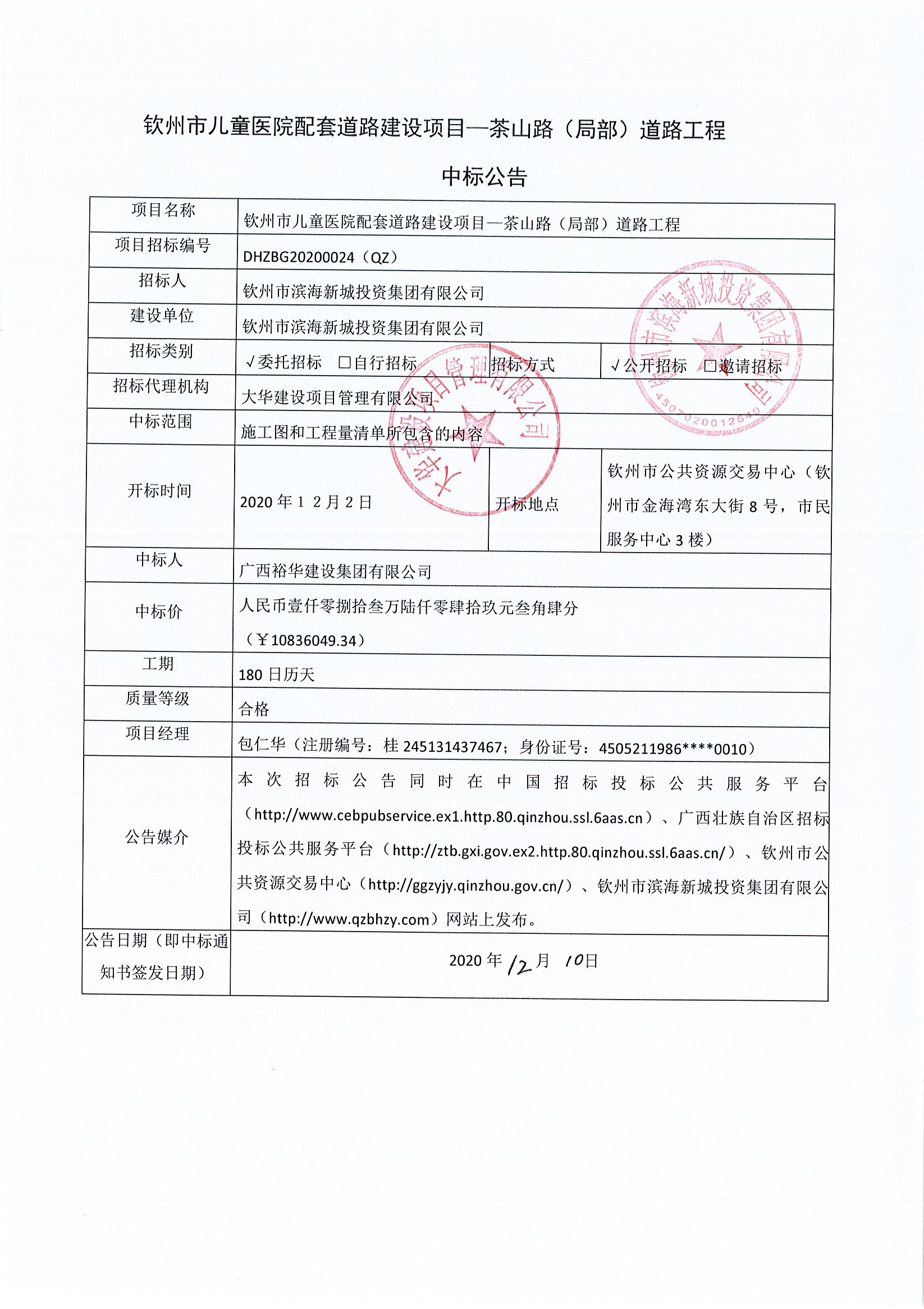 欽州市兒童醫(yī)院配套道路建設(shè)項目-茶山街(局部)道路工程中標公告