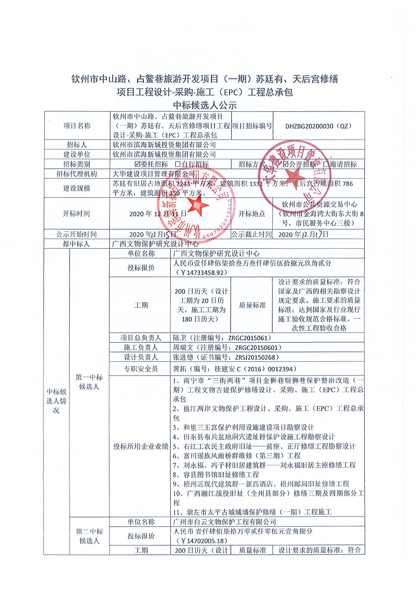 中標公示-欽州市中山路、占鰲巷旅游開發(fā)項目(一期)蘇廷有、天后宮修繕項目工程設(shè)計-采購-施工(EPC)工程總承包中標公告
