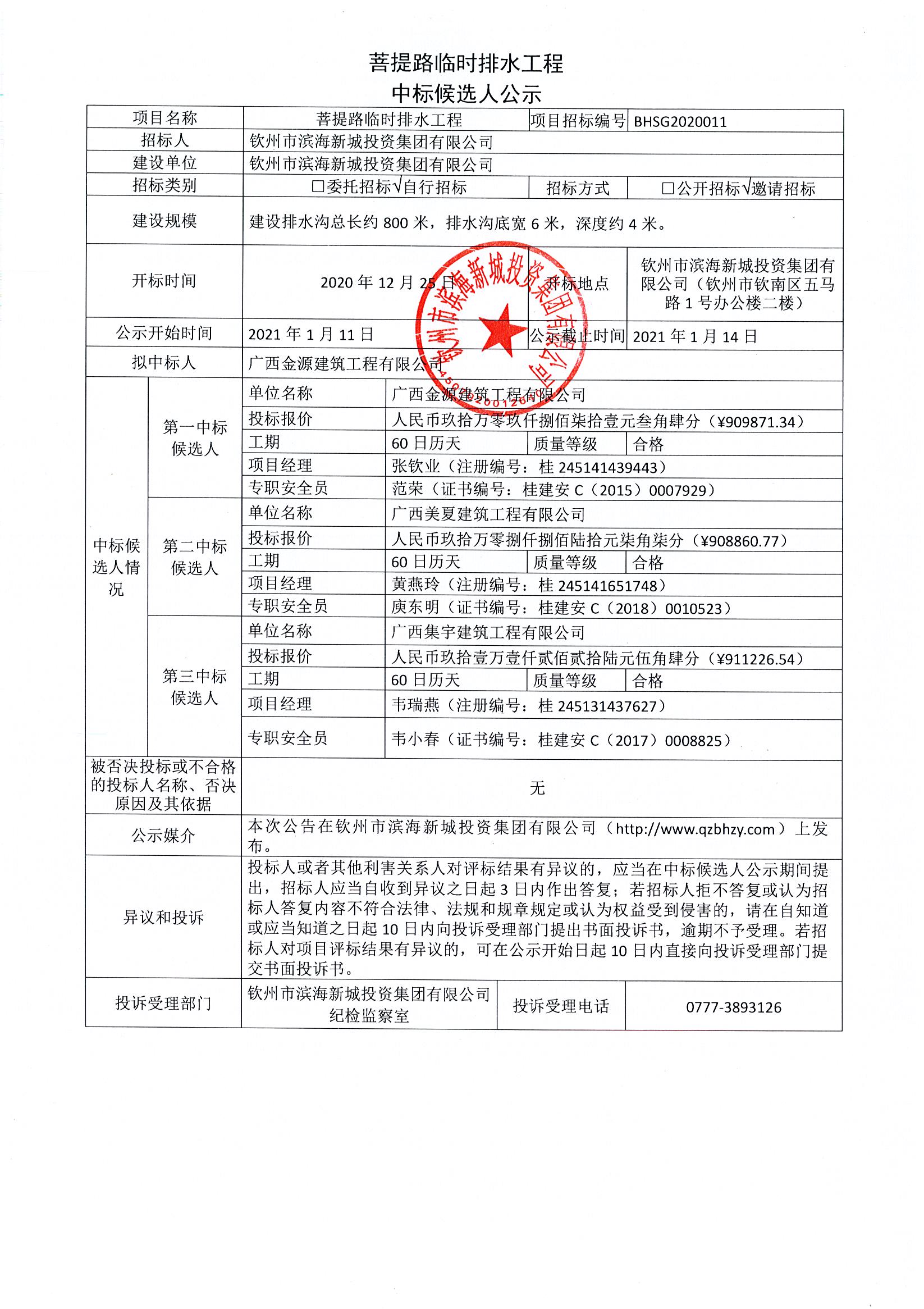 欽州市濱海新城茶山江大街項目、安州大道(珊瑚街至嘉興街段)強弱電綜合管溝及平山東大街(濱江東路-揚帆大道)強弱電綜合管溝項目綜合檢測中標候選人公示