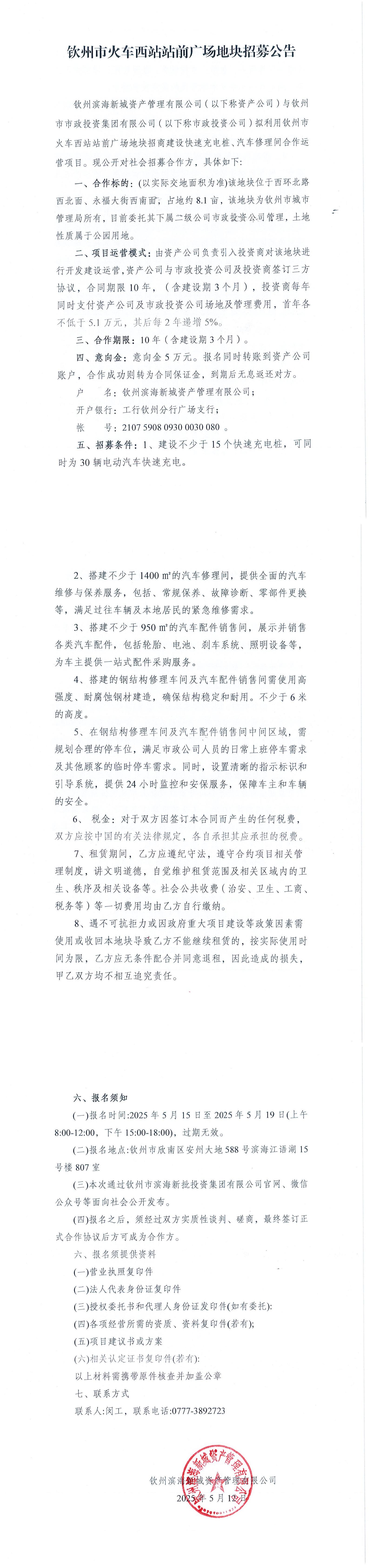 欽州市火車西站站前廣場地塊盤活招募公告