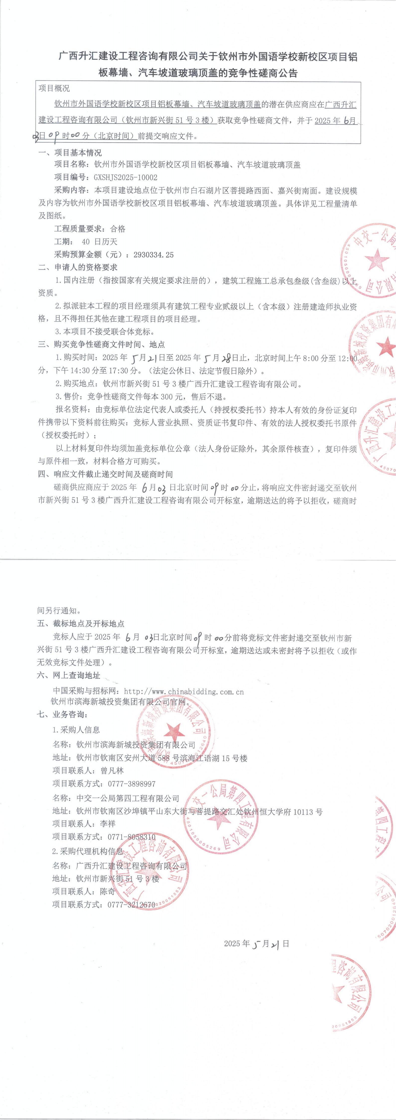 廣西升匯建設(shè)工程咨詢有限公司關(guān)于欽州市外國語學(xué)校新校區(qū)項目鋁板幕墻、汽車坡道玻璃頂蓋的競爭性磋商公告