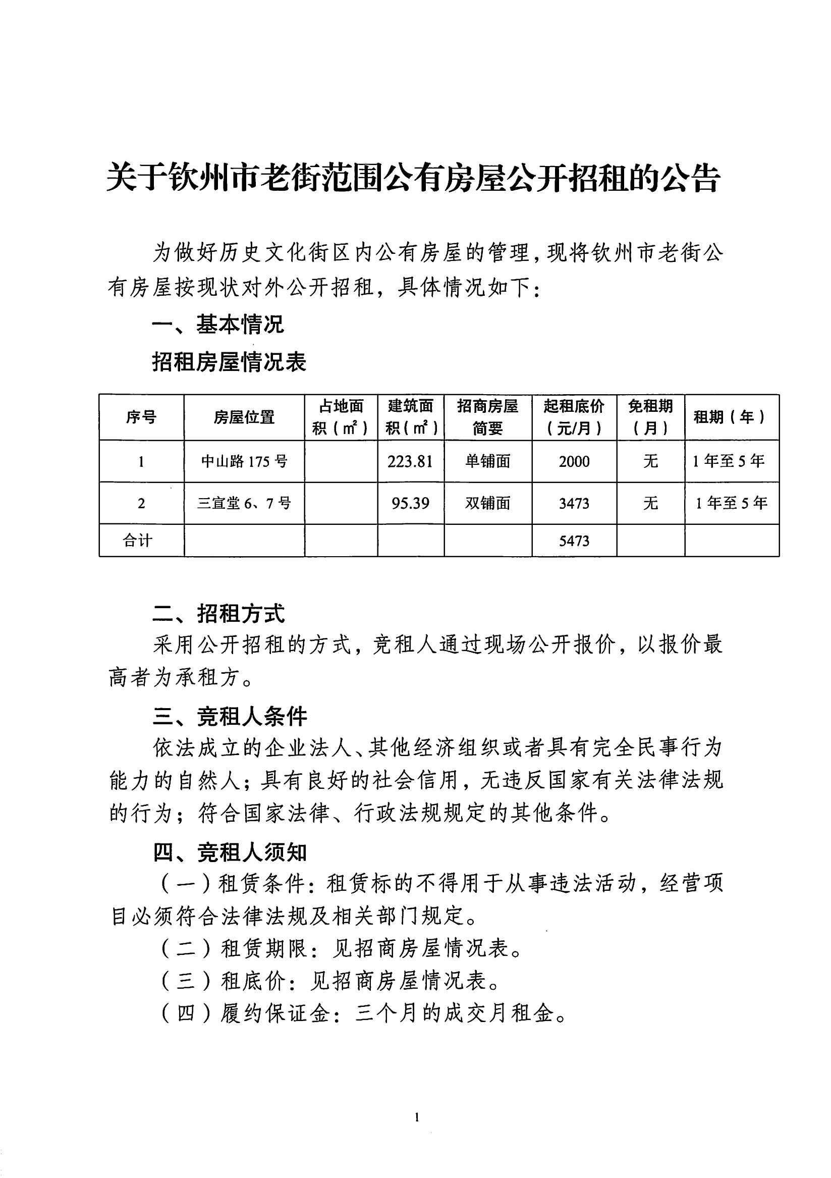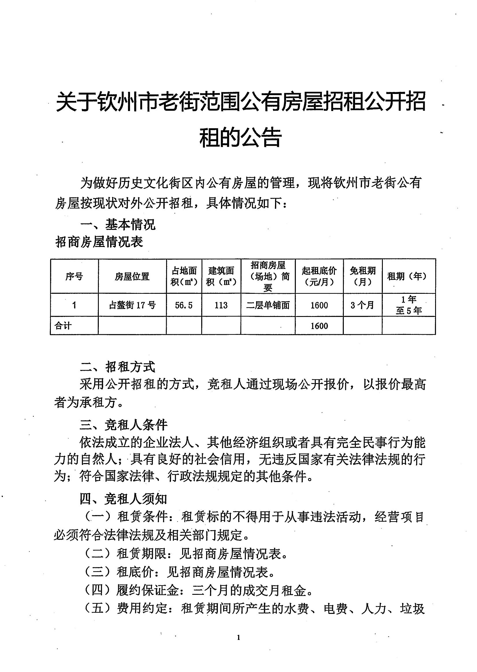 關(guān)于欽州市老街范圍公有房屋(場地)招租公開招租的公告
