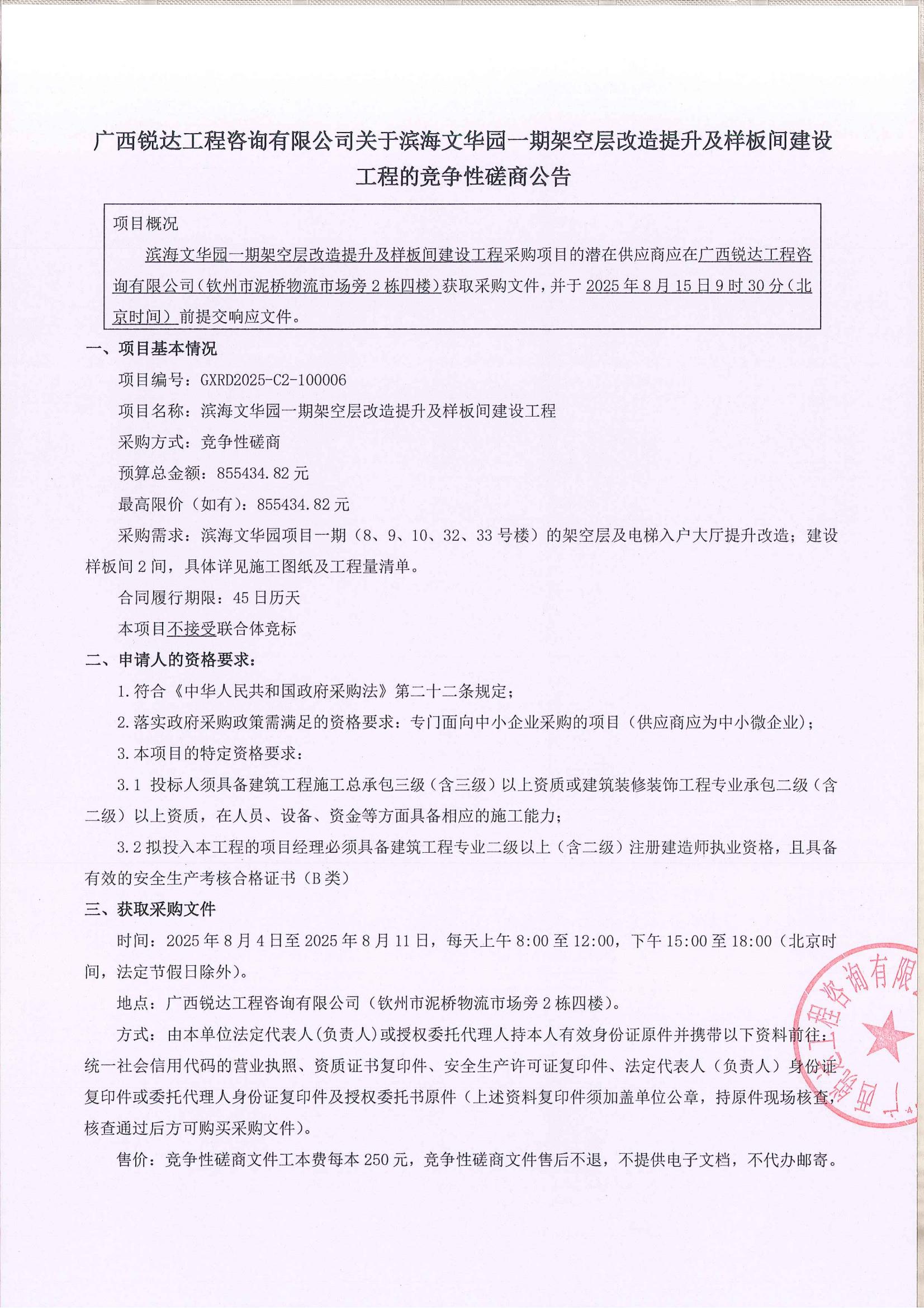 廣西銳達(dá)工程咨詢有限公司關(guān)于濱海文華園一期架空層改造提升及樣板間建設(shè)工程的競爭性磋商公告