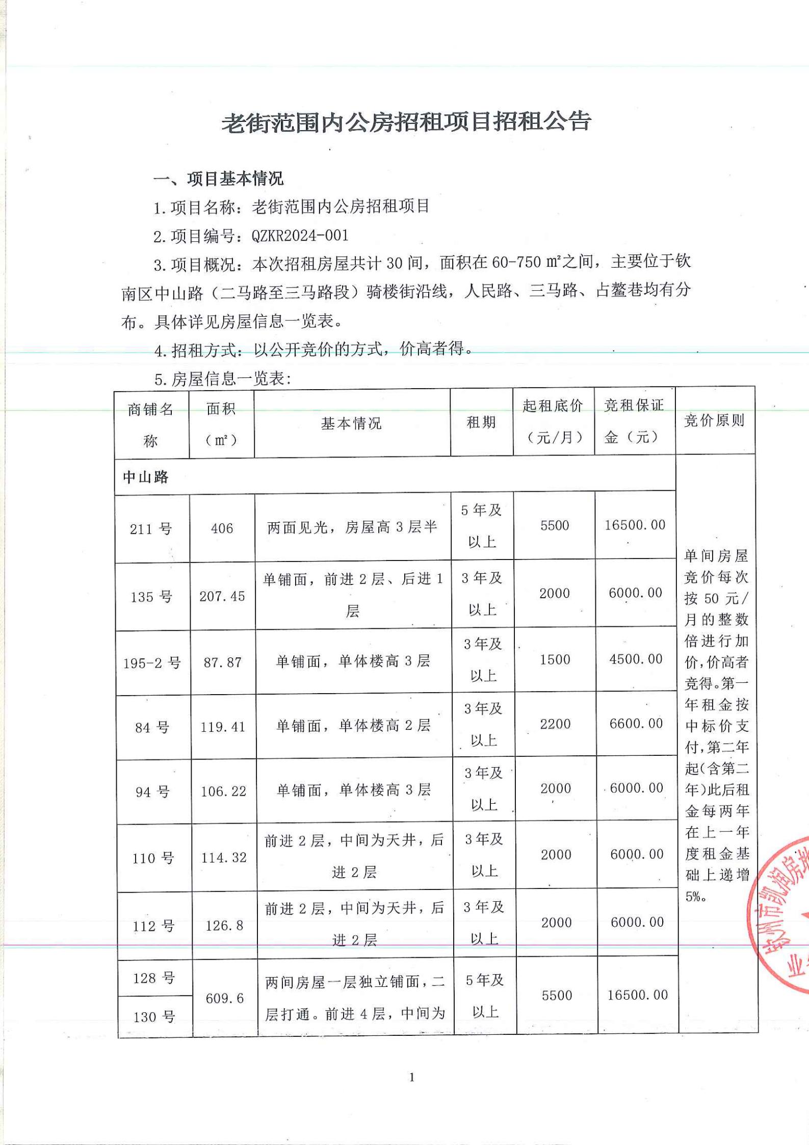 關于欽州市老街范圍中山路47-1號房屋公開招租的公告