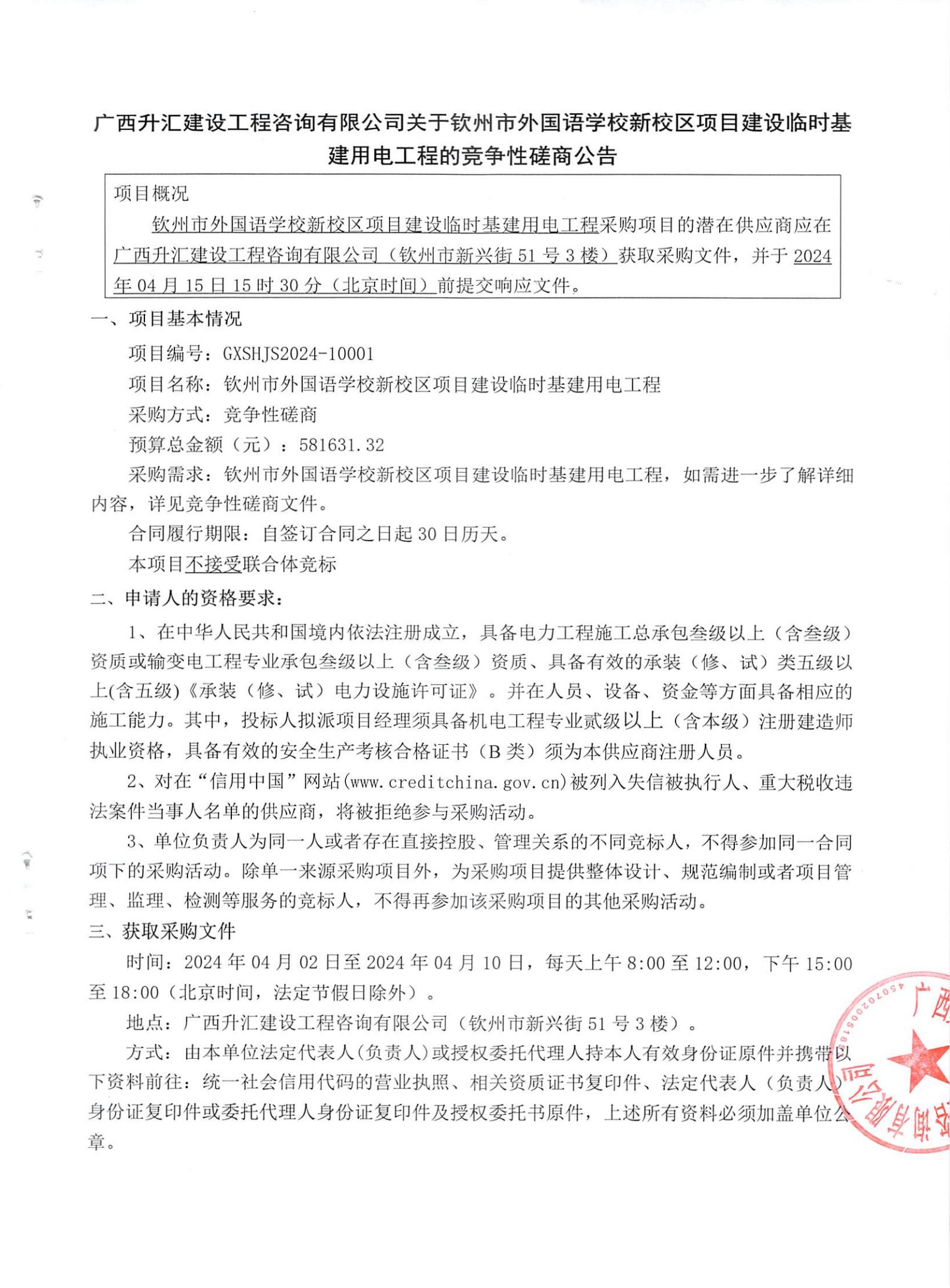 廣西升匯建設工程咨詢有限公司關于欽州市外國語學校新校區(qū)項目建設臨時基建用電工程的競爭性磋商公告