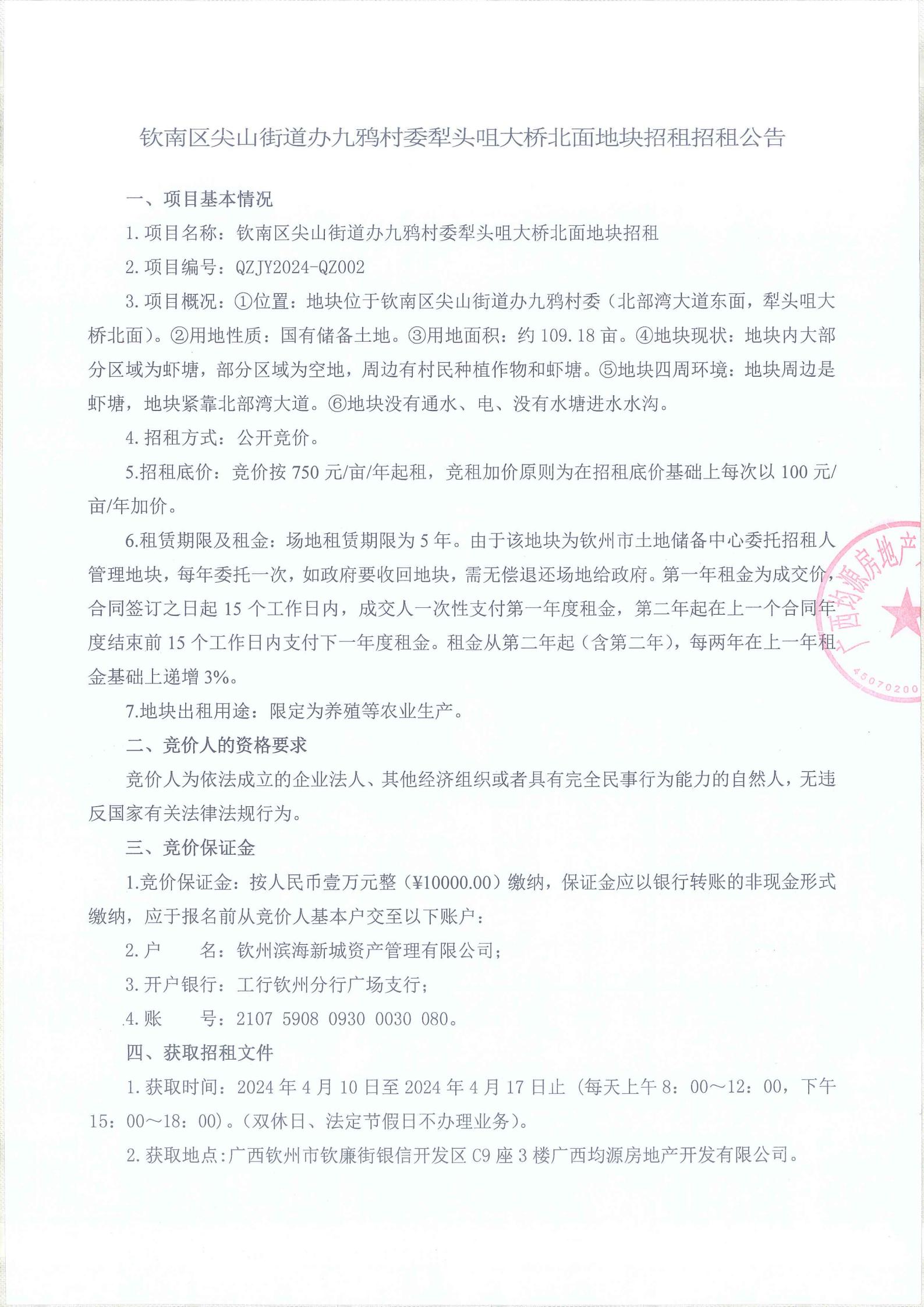 欽州市欽南區(qū)沙埠鎮(zhèn)油路村委上下虎壩村入口三角地塊招租公告