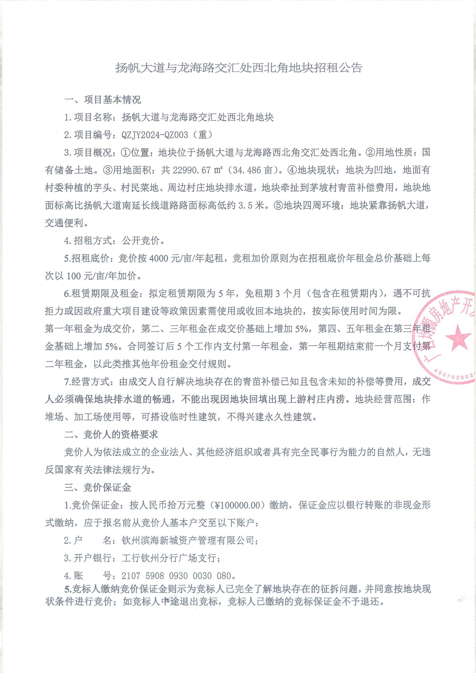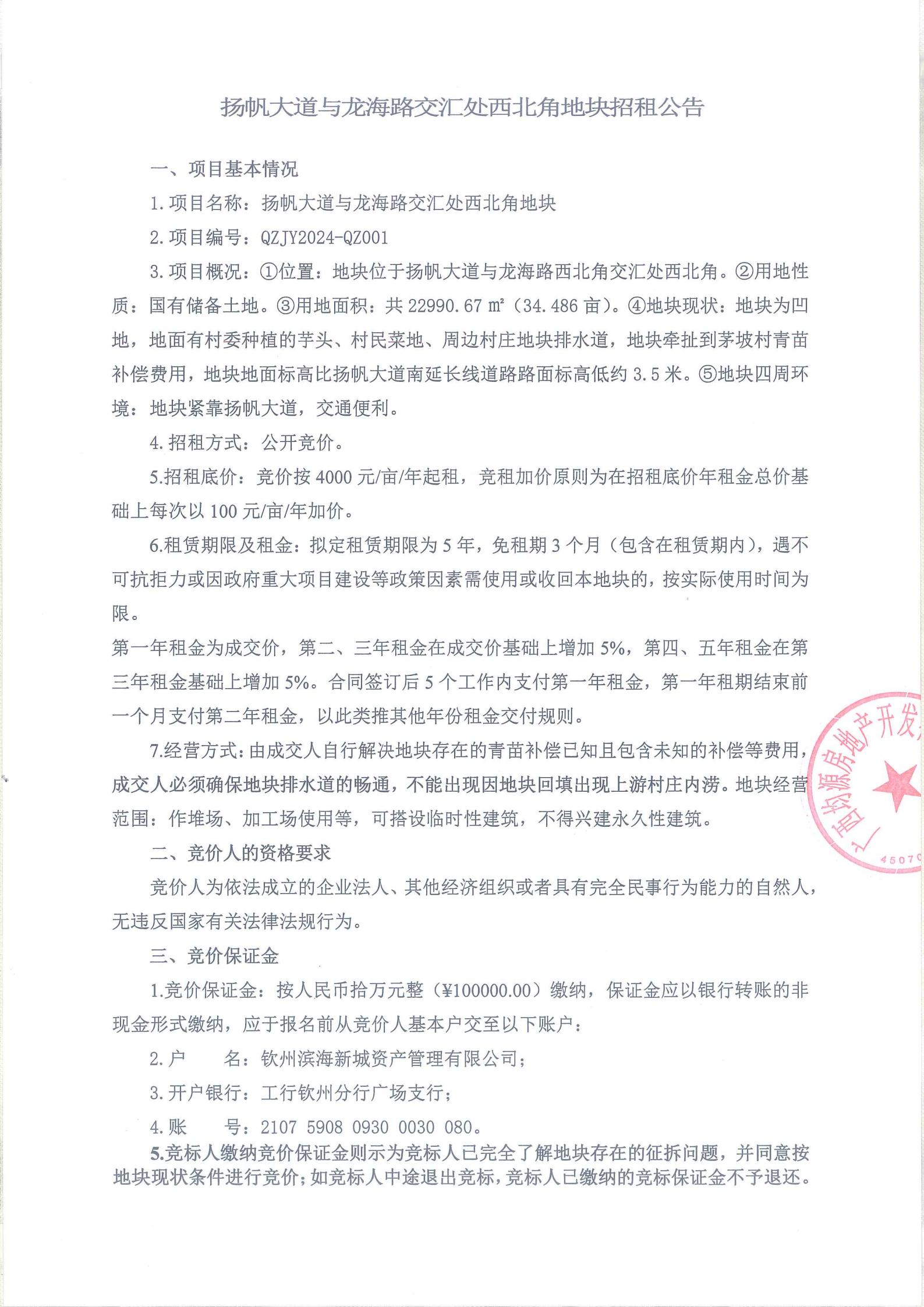 揚帆大道與龍海路交匯處西北角地塊招租公告