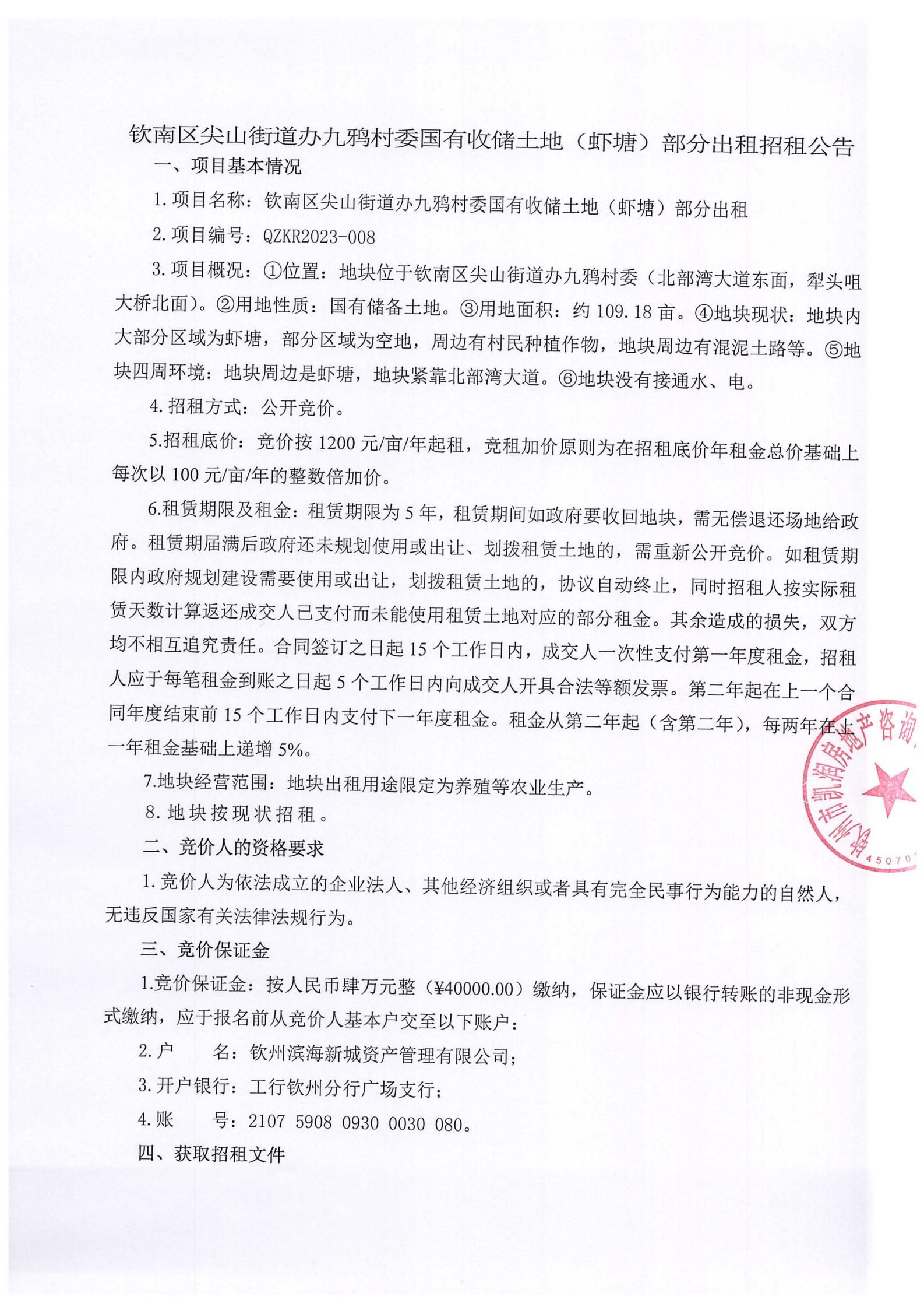 欽南區(qū)尖山街道辦九鴉村委國有收儲土地(蝦塘)部分出租招租公告
